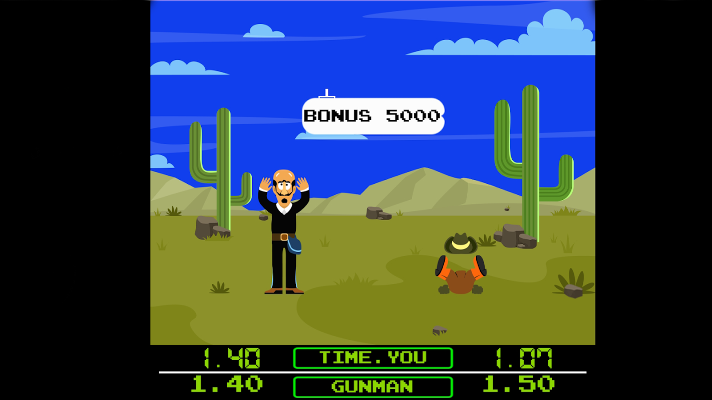 - Gunfight: Players can fight with 2 gunmen at the same time. The player waits for the opponent's eyes to flash (accompanied by a reading 'FIRE!!') before shooting. If the player shoots before the shooters are ready or fires later than the amount of time the shooters would fire after getting ready, the player loses.