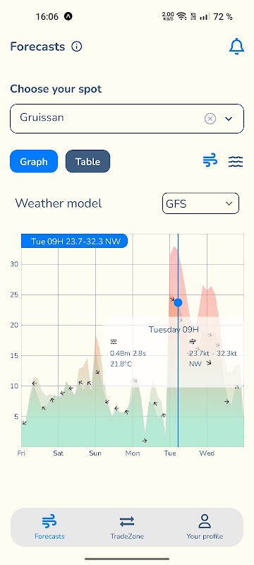 Visualize wind & swell forecasts on charts or in tables, so you can choose how you plan your next session.