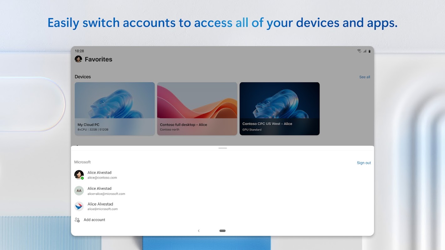 Windows App securely connects you to all remote Windows experiences, including Azure Virtual Desktop, Windows 365, Microsoft Dev Box, Remote Desktop Services, and remote PCs.