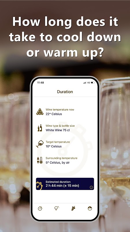 Enter the current temperature of the wine, the size of the bottle, the ambient temperature and the desired serving temperature. The time required to chill or warm is instantly displayed.