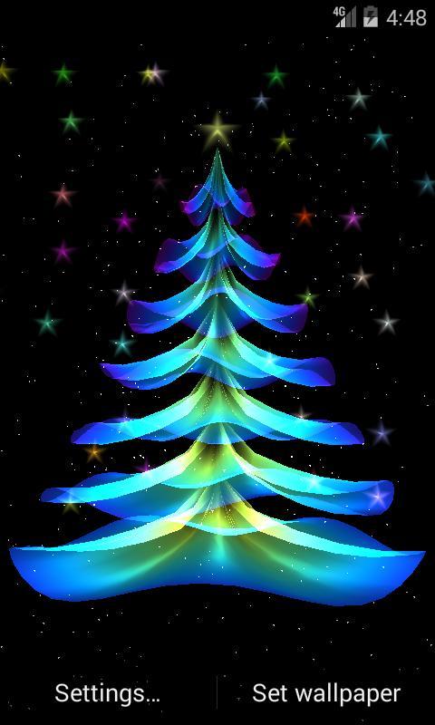 Glowing tree, twinkling stars, flying snow, animated pine wallpaper.