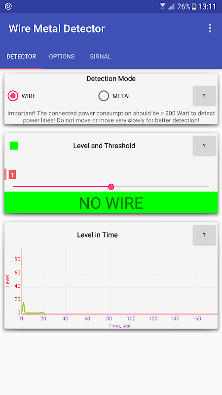 In the Wire Detection Mode the App does analyze the magnetic field which created by the current in the AC power lines (wires). Therefore, the relatively powerful device should be connected to the outlet to create the electromagnetic field strong enough. The power consumption of these devices should be more than 200 Watt for better detection. Only 50-60 Hz AC in the wires does effect on this kind of detector. Detection is working only if the Android device is moving very slowly or nonmoving.