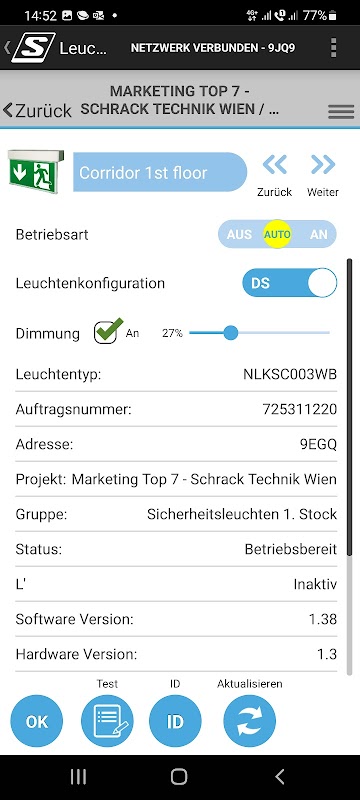 With the app, you can e.g. set maintained/non-maintained operation and dimming, selected luminaires can be made to flash for identification, test times can be created centrally. You receive a cleanly documented test book.The app supports a central mode with automatic synchronisation into the ELIAS web portal.All relevant data and all test books can be stored either locally or in the secure web portal ELIAS (elias.schrack.com).