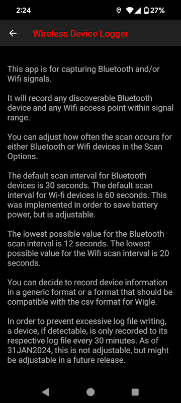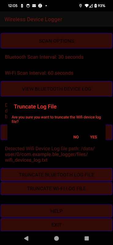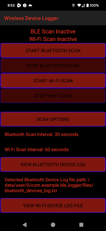 This application logs Bluetooth devices and Wi-Fi Access Points