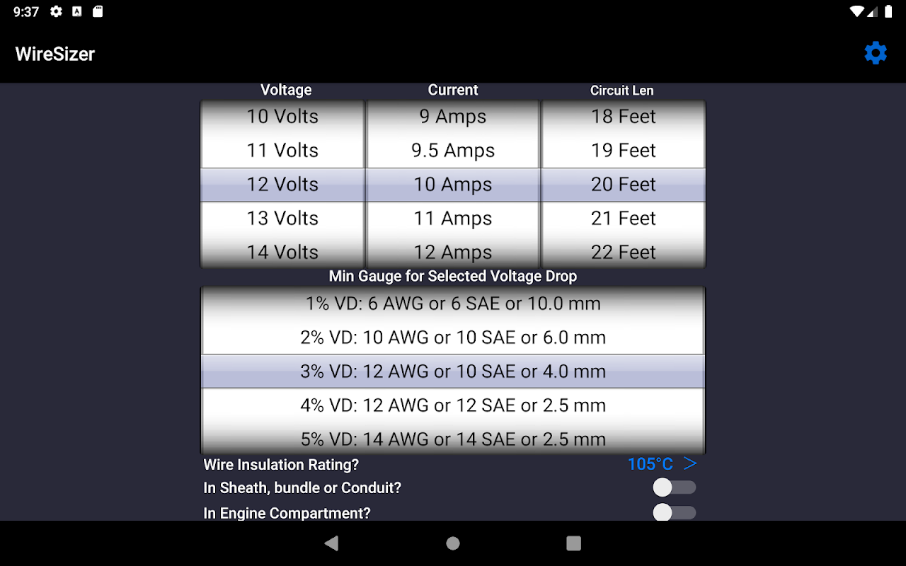 Simply select your DC voltage, current, and total circuit length with flips of your finger. No keyboard required. WireSizer instantly calculates the correct wire gauge for the Voltage Drop percentage you need.