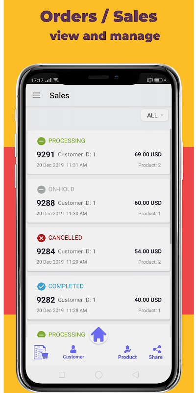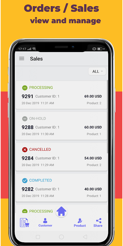 You can see all order customer and his order even you can change order status from mobile phone and also show filter data .