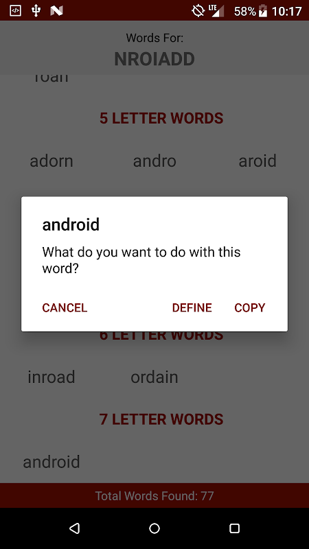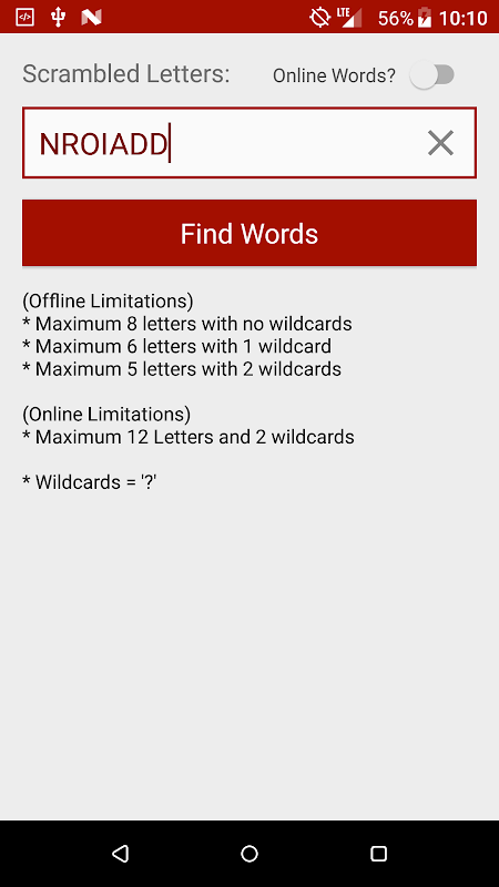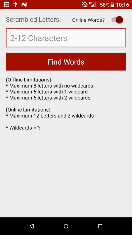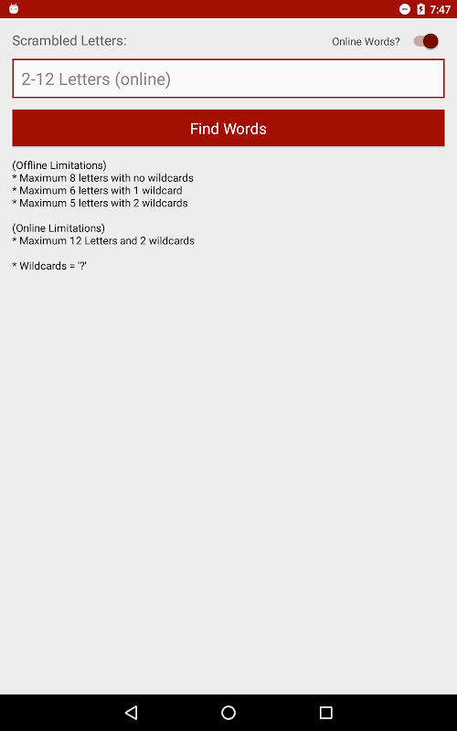 The word finder allows you to find English words from scrambled letters both offline and online. Useful for several word games.