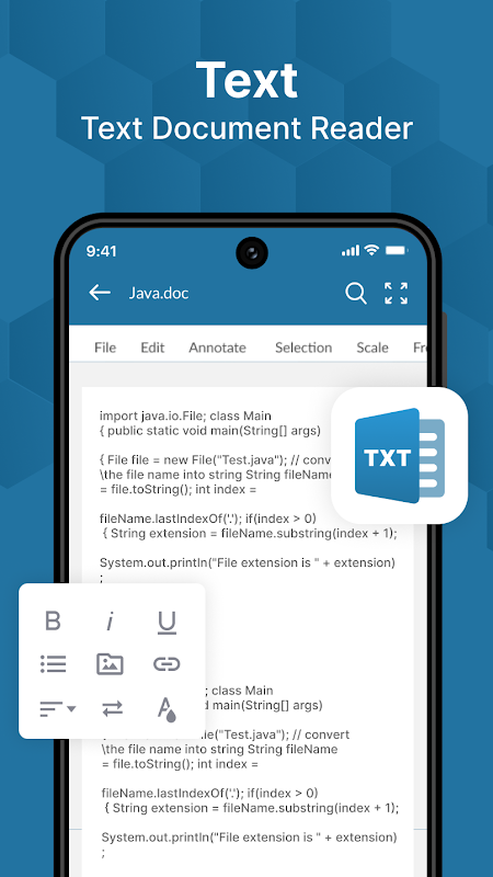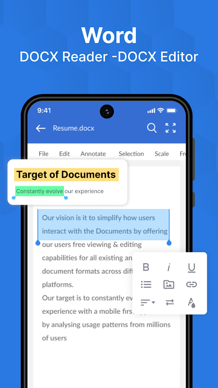 Document Reader and Document Editor for your phone let you easily view Word, Xls, Presentations, Text, and PDF files. It also supports multiple compatibilities with office formats including DOC, DOCX, XLS, TXT, XLSX, PPT, PPTX, and PDF.