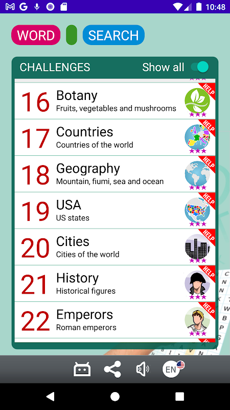 NOTE: Sometimes unexpected words are randomly generated; especially if they are very short (2 or 3 letters); on these occasions, if the word appears in the theme's dictionary, when it is tapped with your finger it will be added to the word list and will be tapped.