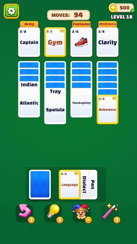 Each level begins with a full board of cards, just like traditional solitaire. First, you place a category card on the board. Then, you carefully move word cards into the category where they belong. Every move matters, so you need to think ahead and plan wisely.