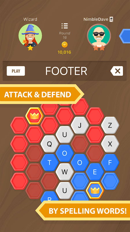 Play words on the board to increase your territory at the expense of your opponent. Capture their crown to win!
