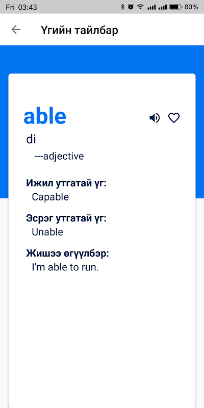 Интернетгүй үед ашиглах боломжтой. Шинэ үг хадгалах зэс байршуулж өгсөн тул дараа хайлтын системд холбогдолгүйгээр хадгалсан үгээ харах боломжтой.