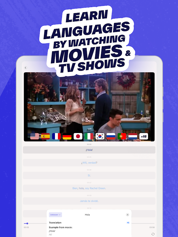 Wordy currently supports 20 languages, including: English, German, French, Spanish, Italian, Japanese, Korean, Portuguese, Russian, Dutch, Swedish, Polish, Danish, Finnish, Greek, Croatian, Norwegian, Romanian, Lithuanian, Ukrainian. Whether your goal is to learn English or master German, French, or Spanish, Wordy helps you progress at every level. The method based on real movie clips is the most natural and enjoyable form of language learning.