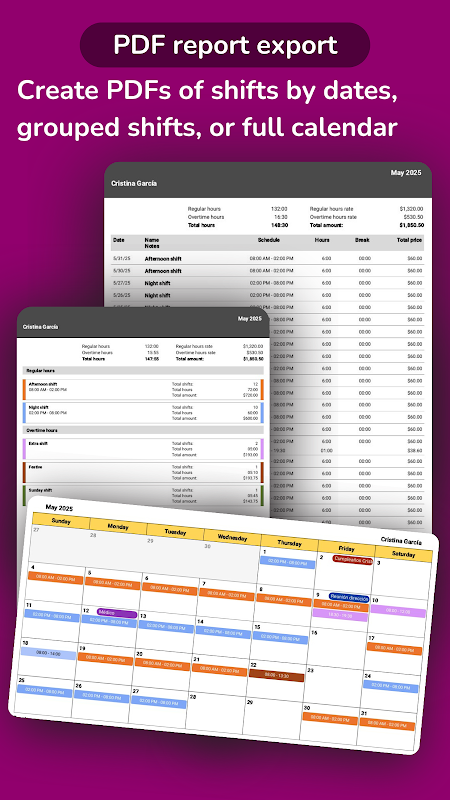 • PDF Export: Generate timesheets, pay stubs, payroll statements, and shift calendars with one tap.