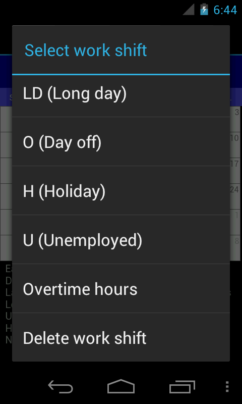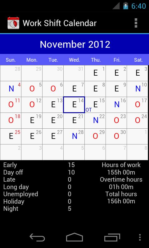 Work Shift Calendar allows you to organize your work shifts using a calendar.