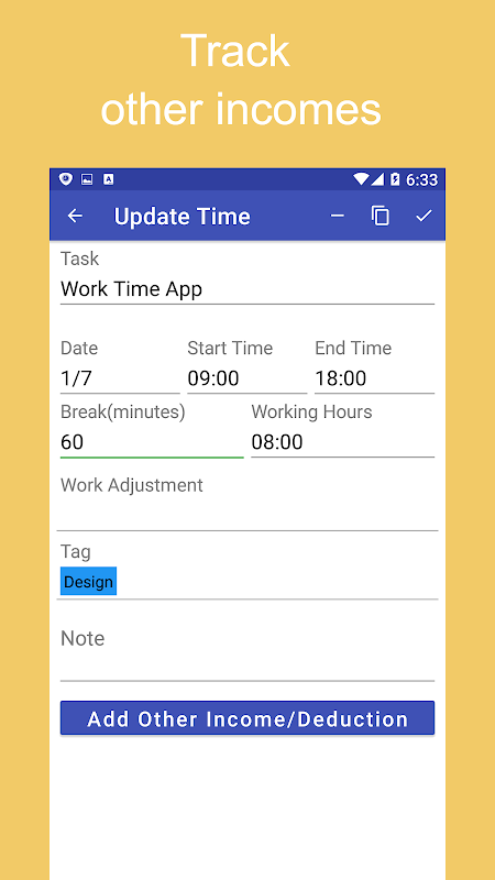 Work Time is quick and easy way to keep track of your working hours and wages over the pay period.