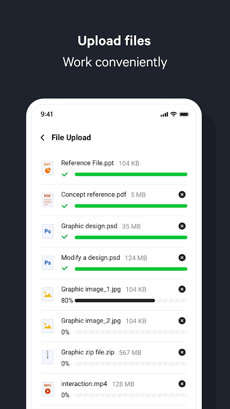 + Files and media (photos, videos, music, and audio): It is required to provide file creation and upload features.