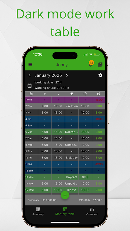 Work timer to track days, working hours, time spent on projects and in business.