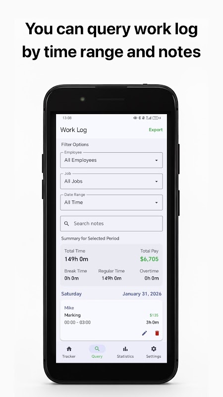 • View complete time logs filtered by employee and job