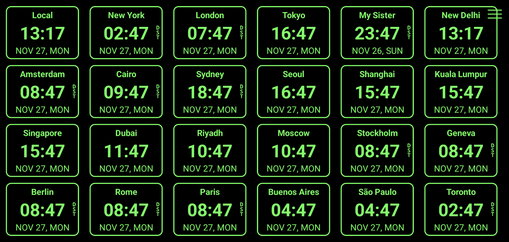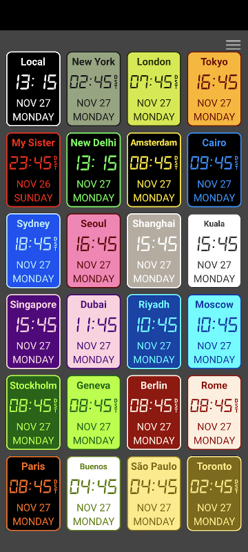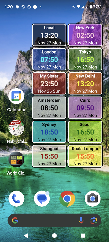 Track all your friends and relatives with up to two dozen clocks on your mobile screen. Use as a desk clock, an office clock or travel clock to show the time in multiple cities across the world. Add as an app widget to your home screen. Refer the home screen widget anytime without opening the app.