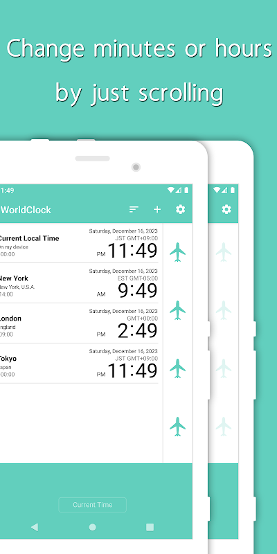 -Scrolling the time bar on the side of the screen up and down simultaneously changes the time in each city to the future or past.