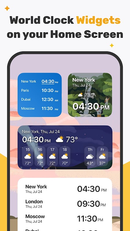 Widgets are a standout feature of World Clock, providing quick access to time and weather data right from the home screen. With customizable designs ranging from minimalist to dynamic digital displays, you can customize the widget style to match your aesthetic preferences or the day-night theme of your device. For example, the MD Military clock widget provides accurate military time tracking, or the ZULU pilot time widget helps you easily manage schedules with international time. Easily check the temperature, track weather changes, view time zones, and view world clock without even opening the app. This convenience makes World Clock a must-have tool for people living fast-paced lives.