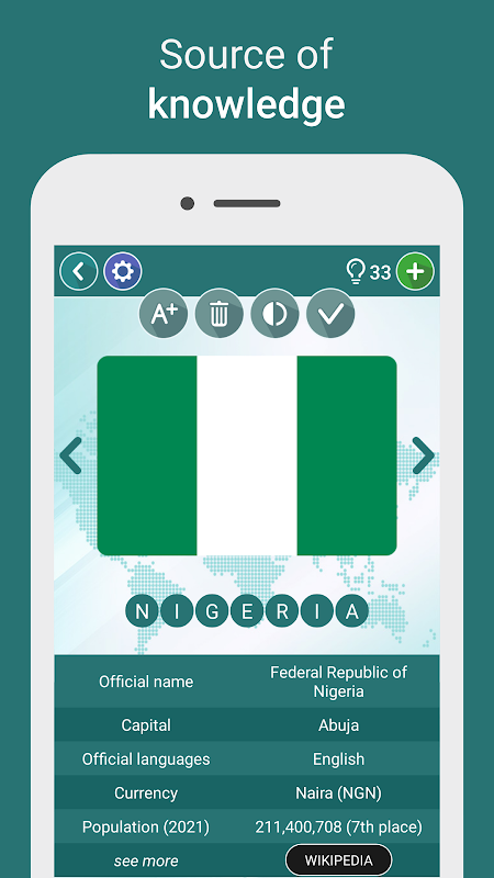Beyond entertainment, World Geography Quiz provides interesting facts for each country, including official name, language, currency, and population.