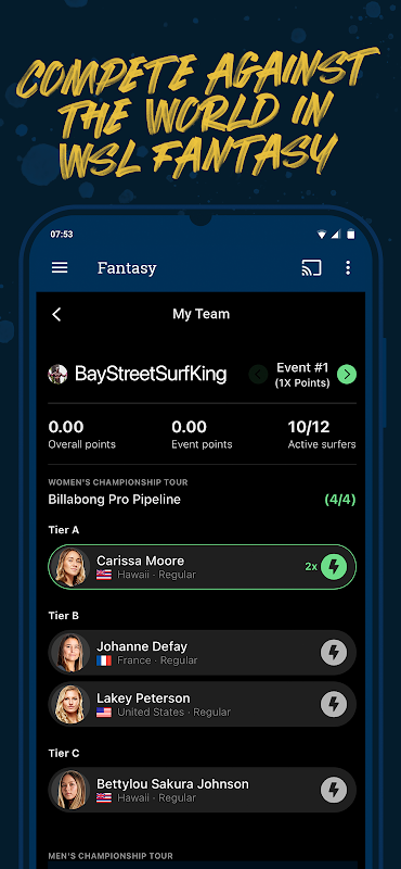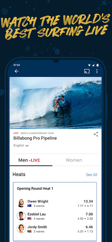 Tune into live broadcasts of Championship Tour, Big Wave, and Challenger Series events anytime, anywhere, completely free.