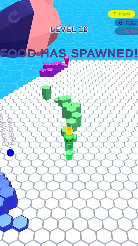 Your goal is to stay as long as possible and not to fail. But you're not the only one in this arena. Eat hexes, avoid other worms, and push them out! The last survivor becomes the winner.
