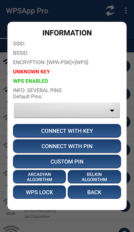This app uses these pins to try the connection and check if the network is vulnerable. It implements several known algorithms for pin generation and some default pins. Also calculates default key for some routers, allows you to view WiFi passwords stored on the device, scans the devices connected to your network and analyzes the quality of the WiFi channels.