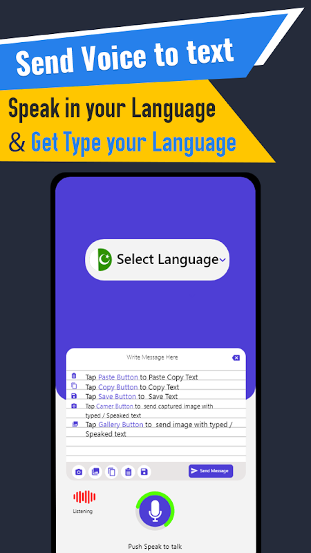 • By using this app you will get rid of typing long messages, so you just have to speak and the app will automatically turns it into text and gives you options to send via any messaging app.