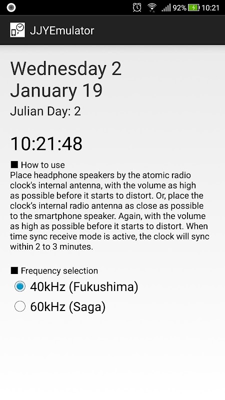 Place headphone speakers by the atomic radio clock's internal antenna, with the volume as high as possible before it starts to distort. Or, place the clock’s internal radio antenna as close as possible to the smartphone speaker. Again, with the volume as high as possible before it starts to distort. When time sync receive mode is active, the clock will sync within 2 to 3 minutes.