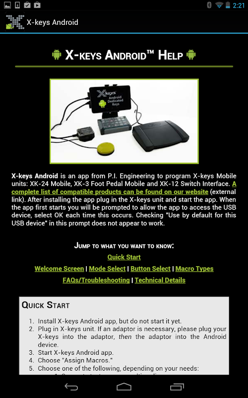 X-keys Android is a programming utility for X-keys Mobile programmable keypads and input devices. X-keys buttons and pedals can send keyboard commands, mouse actions, game controller commands, multimedia commands, and touches or swipes.