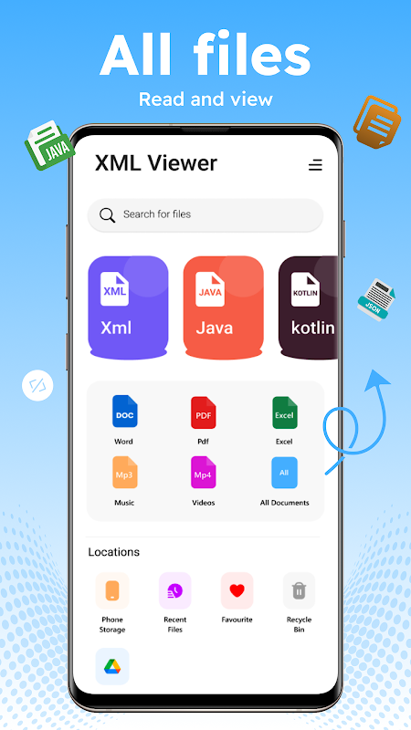 Xml file viewer is a file reader and viewer app for android devices. Xml Viewer for Android allows the users to open and view HTML, JAVA, JSON, and TEXT files. XML Viewer for Android is a user-friendly file viewer as the users can access all files on their device anytime. Xml viewer is all file opener and reader that allows the users to manage their XML files and other files. This XML file viewer for android helps you to make more storage capacity in your device. Xml Viewer and Xml reader will place the Html, Java, Json, Text, and Xml files into their specific folders. XML reader provides easy access to all files to the users as they are arranged in their respective folders. Moreover, all files are automatically updated in their folders. XML Viewer for Android is an easily accessible tool to read java and txt files in academics.
