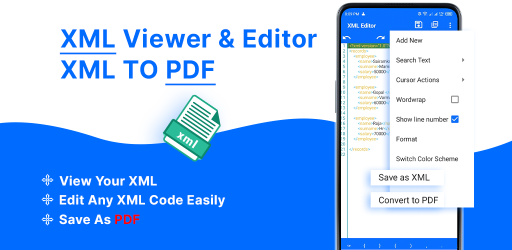 XML Editor: XML viewer and editor to read xml files and covert to pdf