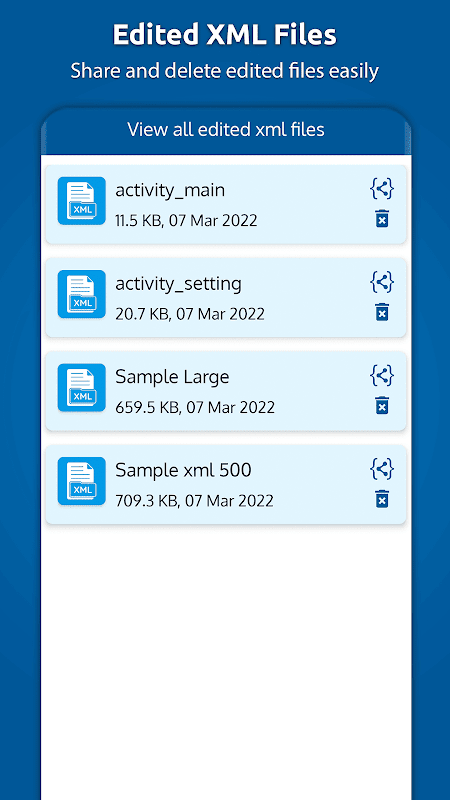 The XML File Reader App gives you the ability to view the converted PDF list and to view any PDF from that list. With the XML reader app, you can also delete or share the converted PDF file.
