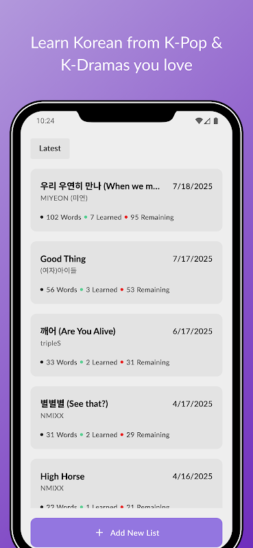 Search for your favorite songs and dramas to instantly generate vocabulary lists from real lyrics and dialogues.
