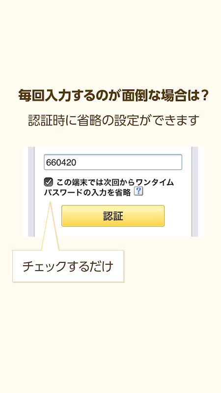 One-time password is a security function that strongly protects your Yahoo! JAPAN ID from unauthorized use. When you start the app, you will be issued a password that is valid only once.