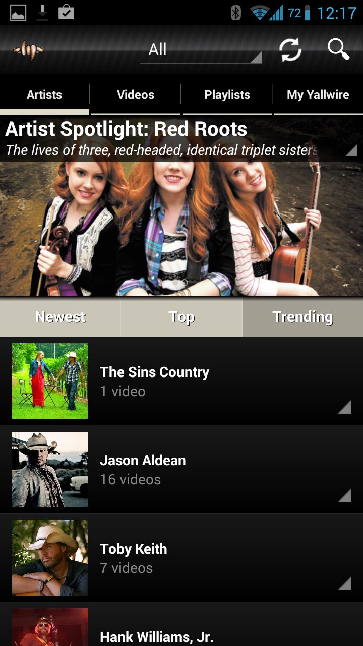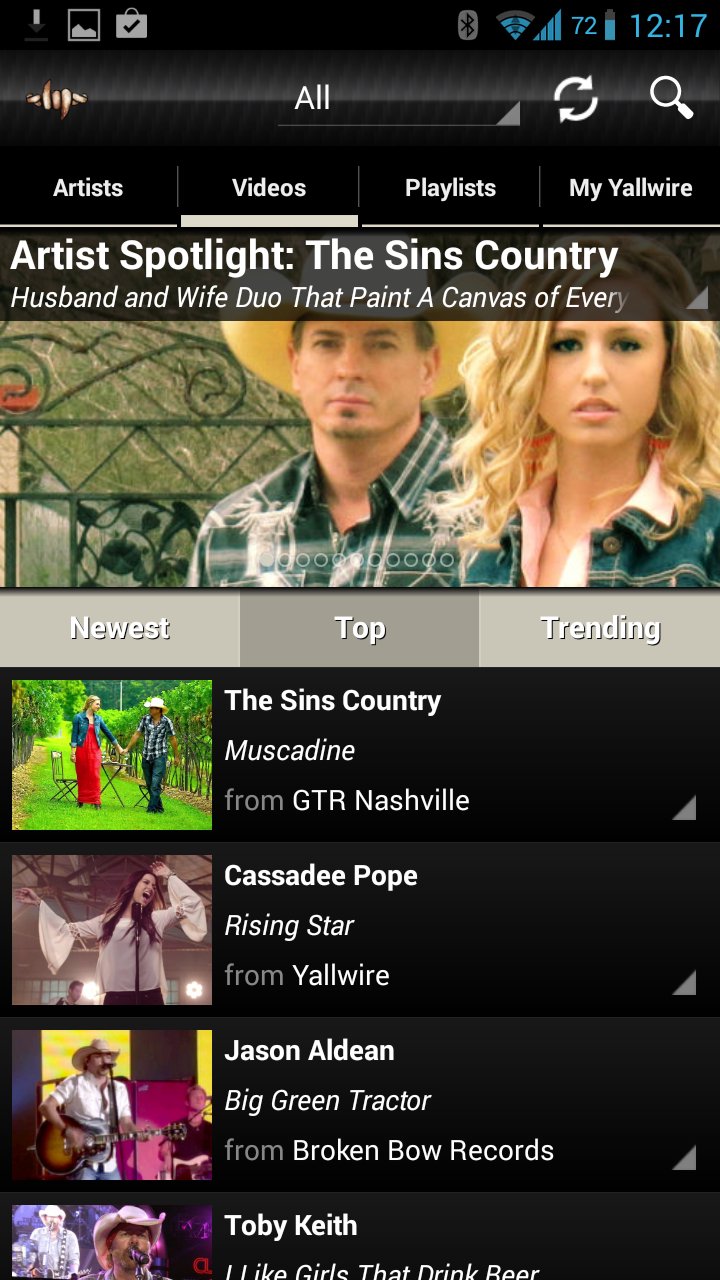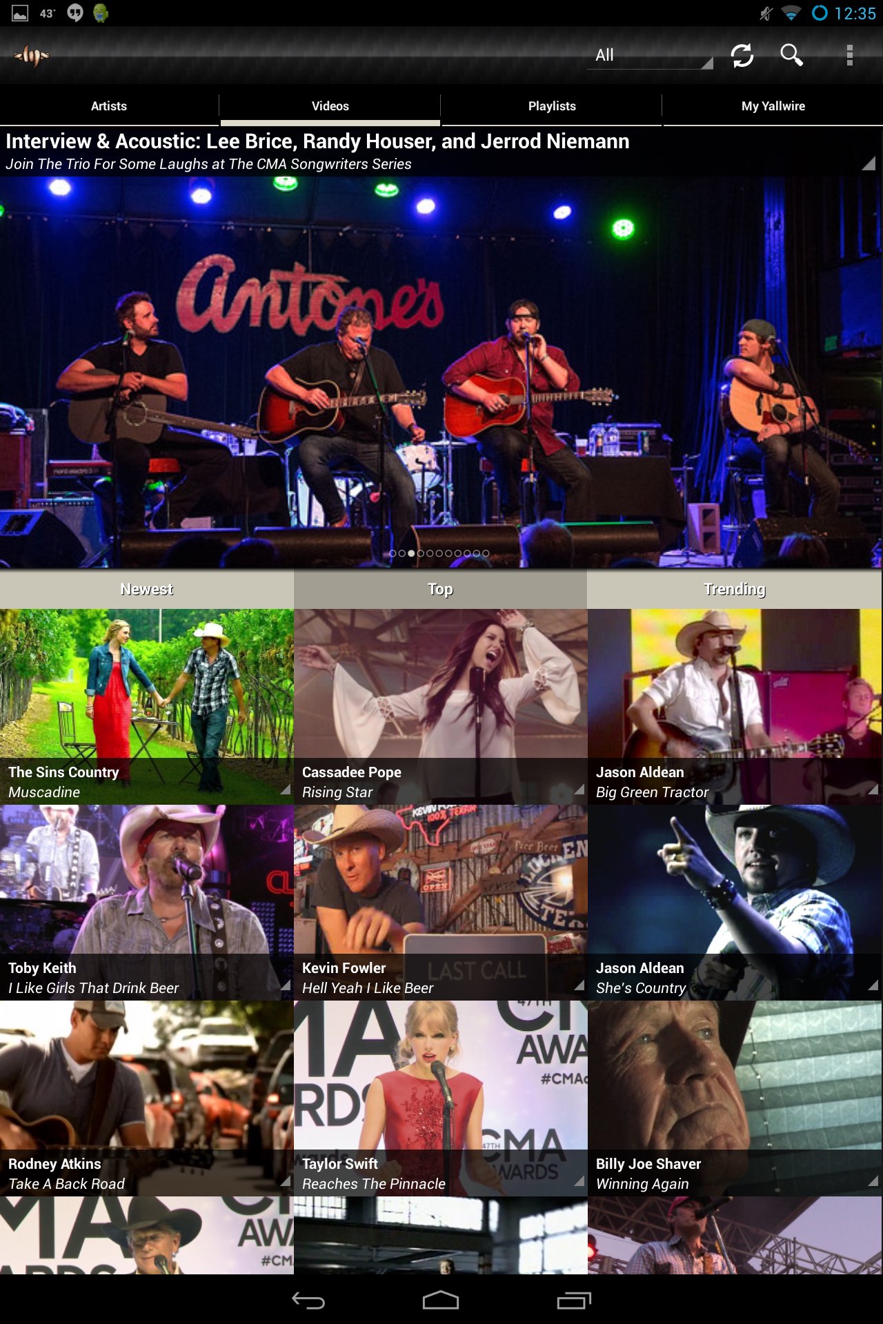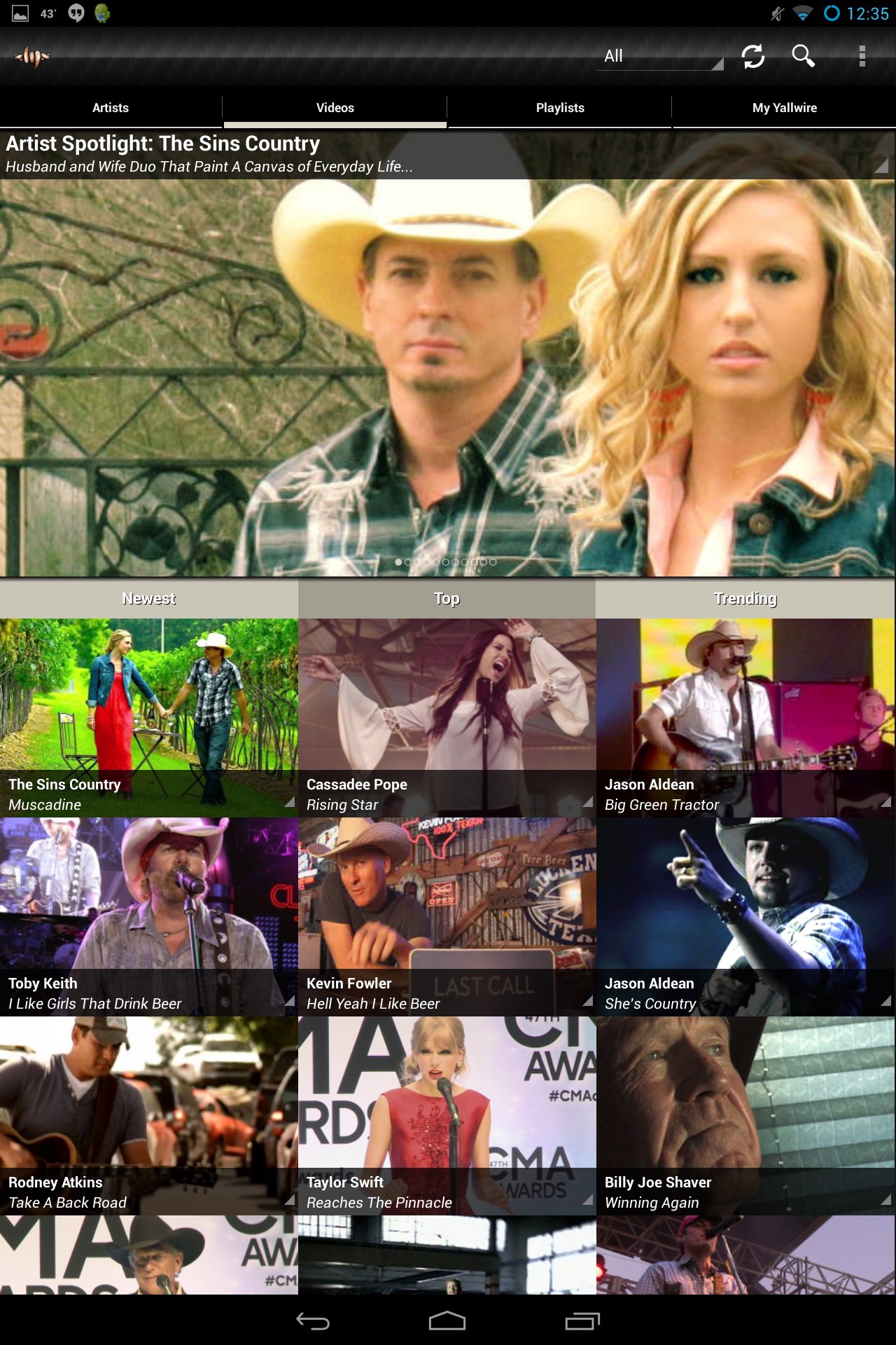 Watch the latest & greatest music videos, live performances and on-camera interviews from your favorite country artists with Yallwire's exclusive Android app. In addition to official music videos & exciting original productions featuring both mainstream & emerging Country, Bluegrass and Christian artists, discover new music using Party Mode. Just pick an artist or song and it'll play what you like.