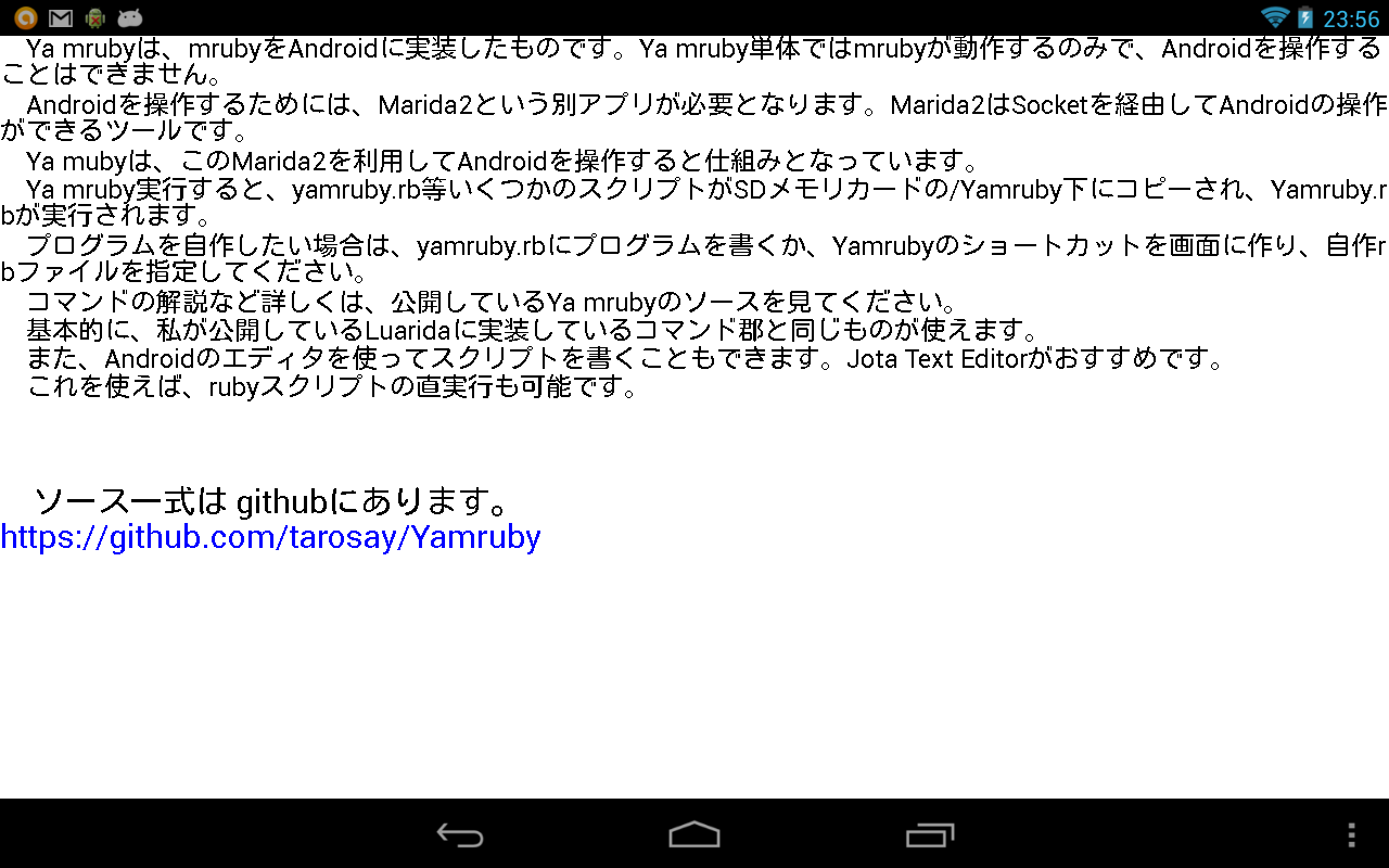 Ya mubyは、このMarida2を利用してAndroidを操作すると仕組みとなっています。Ya mruby実行すると、yamruby.rb等いくつかのスクリプトがSDメモリカードの/Yamruby下にコピーされ、Yamruby.rbが実行されます。