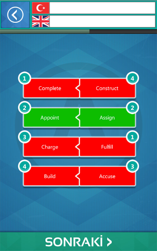 Bir ekrandaki eşlenmek üzere sunulan İngilizce kelimelerin sayısı bölüm içindeki kelimeler öğrenildikçe artırılmaktadır.