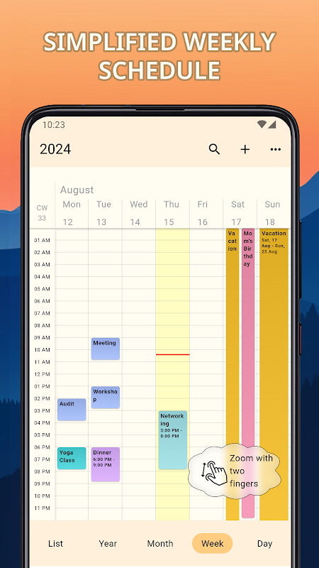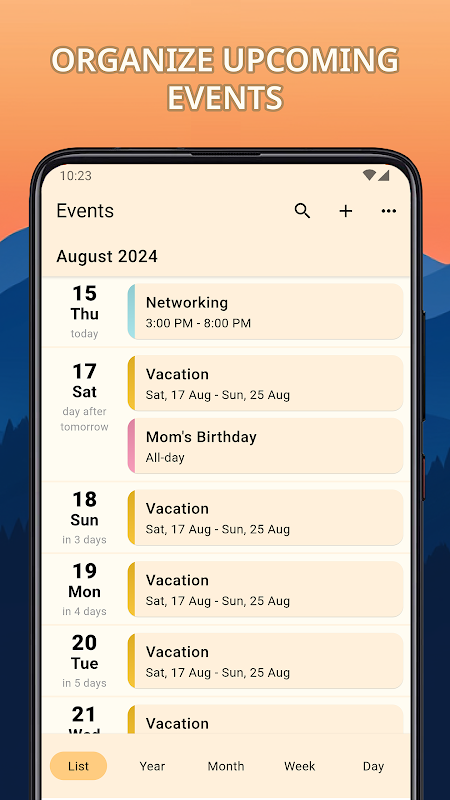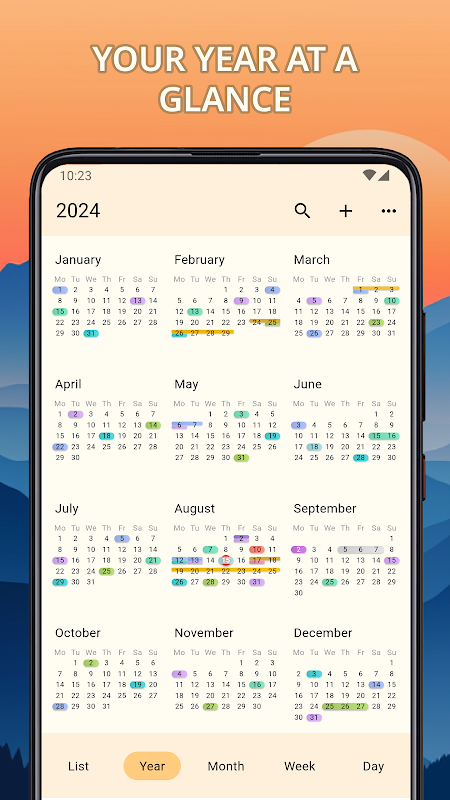 • Multiple View Modes: Seamlessly switch between different calendar views—Year, Month, Week, Day, and List. Whether you need a broad overview or a detailed day-by-day plan, the app has you covered.