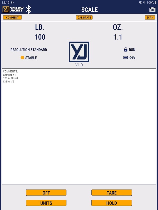 The YELLOW JACKET® YJScale app allows you to monitor and control your 68864 Wireless Refrigerant Scale (hardware purchase required).