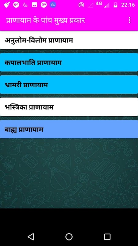 Padamasan,shavasan,vjraasan,trikonasan and gomukhasan are most five important yogasan to do daily for good healthy life.Anulom-vilom, kapalbhati, bhramari, bhastrika and bahaay pranayam are most important five types of pranayam to get good healthy life. If anybody perform these types of yogasan and pranayam daily,he will certainly get healthy life,strong body and peaceful mind.How to perform above-mentioned types of yogasan and pranayam, their benefits and precautions while performing, have been discussed in detail in the application.