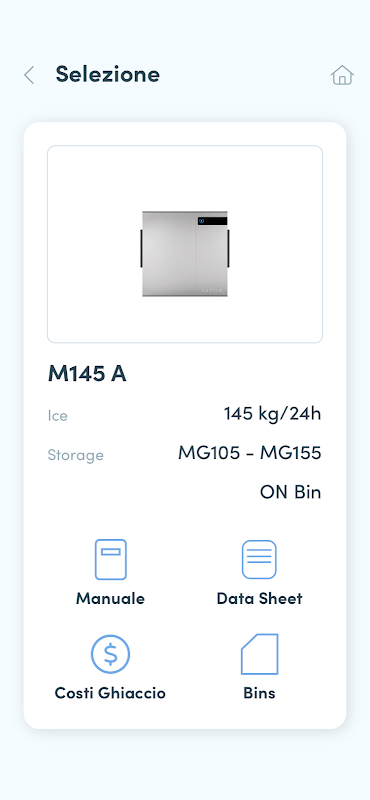 Once the ice maker has been selected, the app provides all its specific information such as: technical data sheet, user manual,