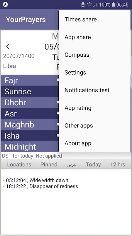 In the absence of the astronomical dawn sign, YourPrayers app calculates the lowest time of sunlight under the horizon as an alternative to some northern regions in the summer in which the degradation is less than its angle.