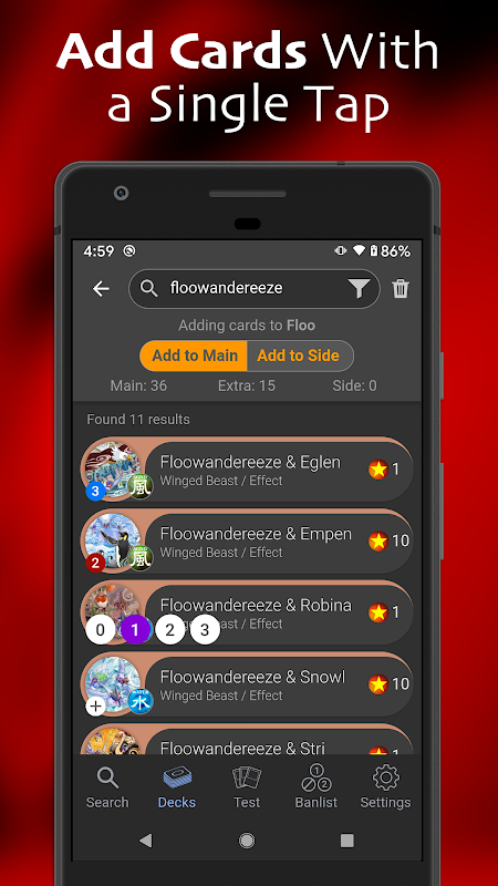 The deck building process has been streamlined to allow you to find and add the cards you want quickly and efficiently. Add cards to your deck with a single tap, and change the amount or remove the card with another tap.