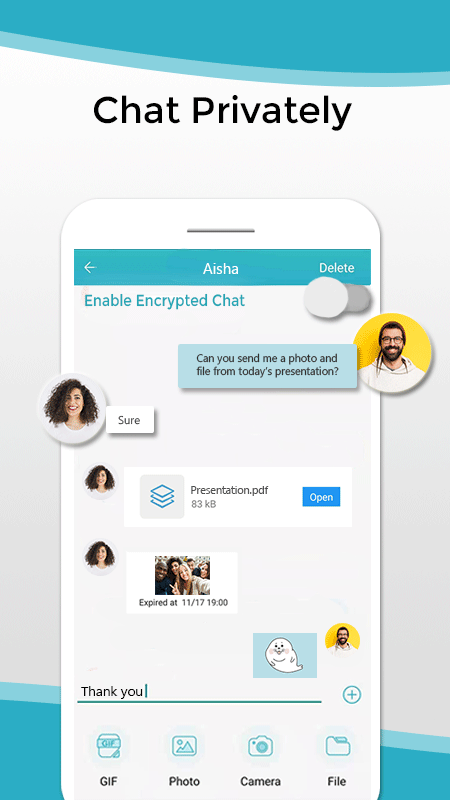 Stay in touch with your close friends without compromising your privacy by using the encrypted chat feature. The chat history is cleared as soon as the receiver has finished reading the message to ensure that there are no screenshots of the conversation.