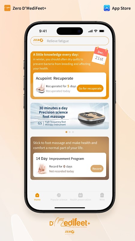 Zero D'MediFeet+ is an innovative health management app designed to synchronize with the high-frequency foot recuperator, D'MediFeet. Beyond just controlling the device remotely, the app offers valuable educational content to guide users in utilizing D'MediFeet effectively