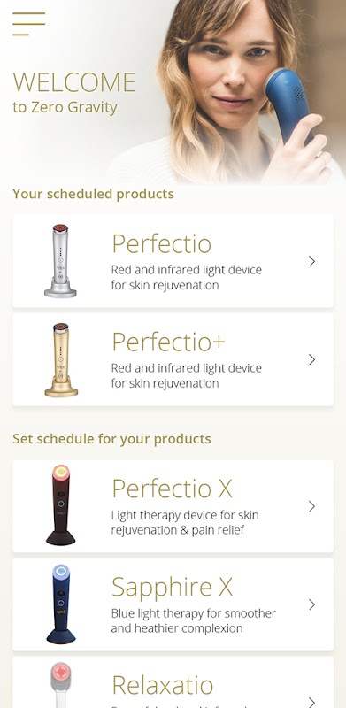 Zero Gravity App will create your facial treatment schedule and track its progress. Taking to account your age, skin type, wrinkle degree and gender, our application will generate a treatment schedule to fit your needs. You can use the application to track the treatment time per each facial part while having the app displaying on the screen the exact section to work on. A quick access to our online guideline, videos, contact us information.